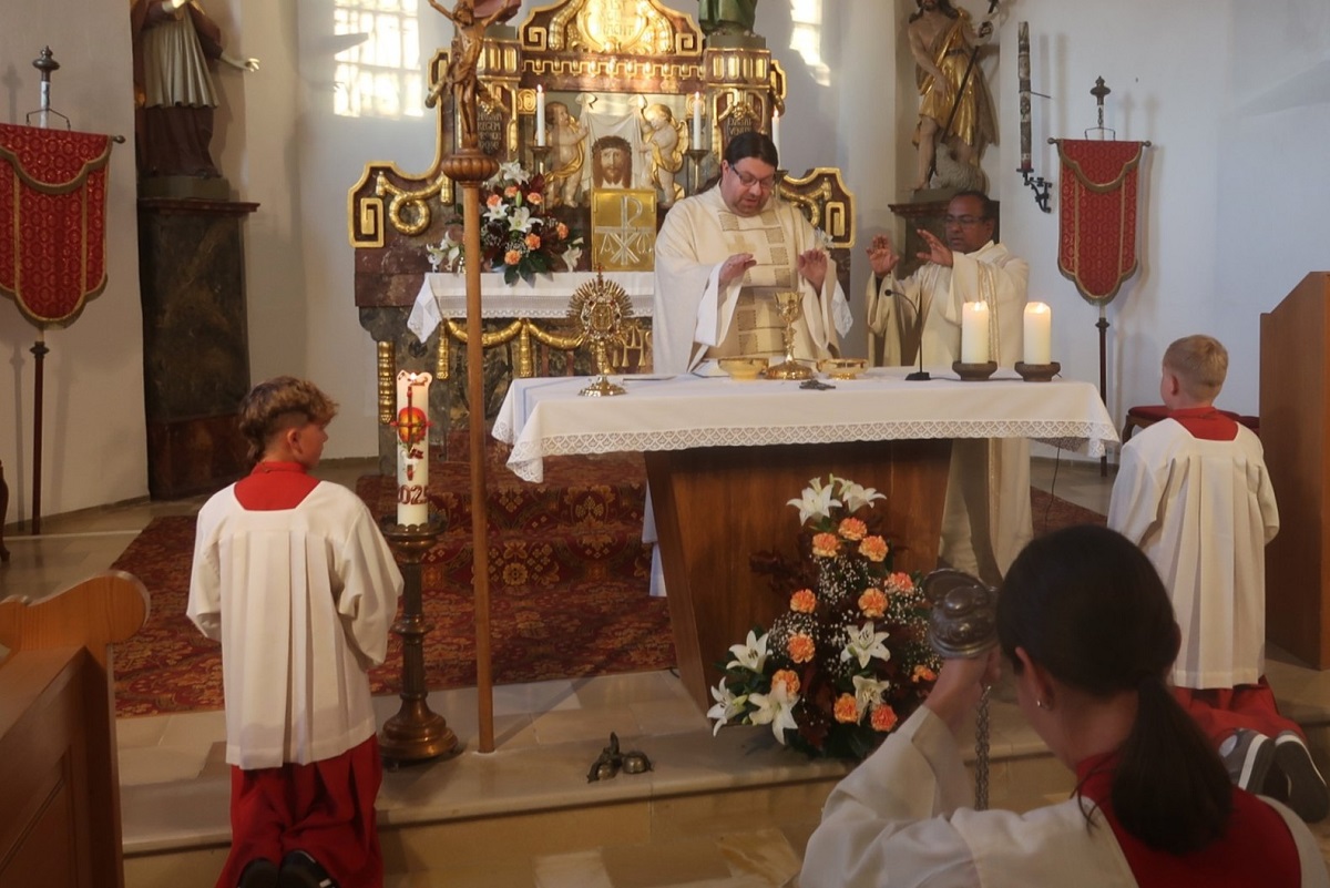 Die Vorabendmesse am Samstag war geprägt vom frohen Gesang des Kirchenchors Wutschdorf unter Leitung von Lukas Schöpf. Der religiöse Teil oblag dem Zelebranten, Pater Johannes Bosco Ernstberger aus Eschenbach. Einleitend gab er seiner Freude Ausdruck, dass er schon einige Male in Vilseck bei verschiedenen Anlässen Gottesdienst feiern durfte. Dem Spruch „Kurze Predigt, lange Bratwürst‘“ könne er heute nicht nachgeben, meinte er.