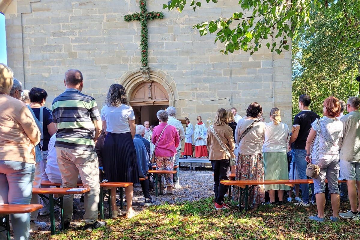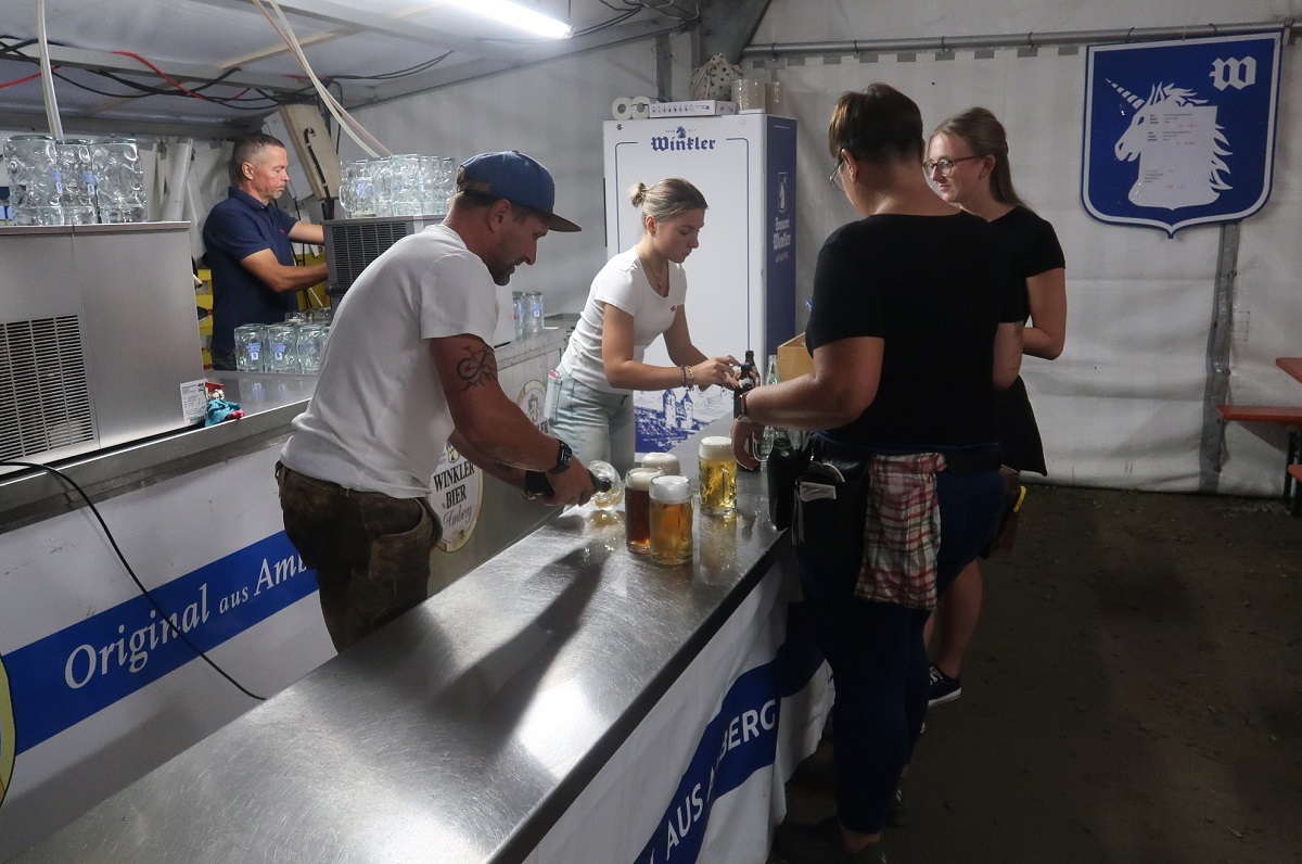 Anschließend ging es auf dem Festplatz hinter der Bergkirche hoch her. Fleißige Helfer hatten alle Hände voll zu tun, die hungrigen und durstigen Gäste aus Nah und Fern zufriedenzustellen. Einige suchten sogar im kühlen Bierzelt Schutz vor der Sonne. Bis in die späten Nachmittagsstunden herrschte Hochbetrieb. Plaudernd saßen die Besucher bis in die späten Nachmittagsstunden beisammen und freuten sich über das Wiedersehen mit so manchem Bekannten, den man lange nicht gesehen hatte.