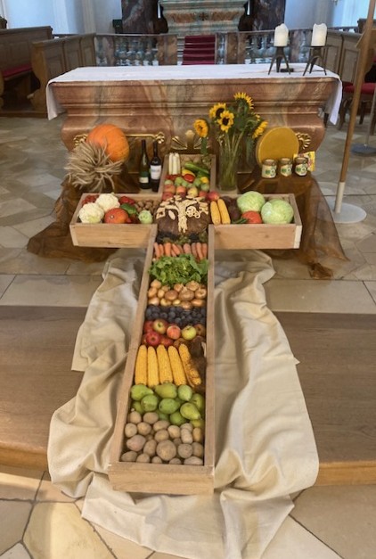 Sowohl für die reichen Erntegaben des Jahres, als auch für das Geschenk der Liebe und Treue, sprachen die Paare dem Herrgott ihren Dank aus. Pfarrvikar Pater Jimmy Joseph wies auf den Geber alles Guten hin: „Alles was unser Leben trägt, kommt aus Gottes Hand“, sagte er. „Ihr habt in hellen und dunklen Stunden auf den Herrn vertraut, denn er war und ist und bleibt der Dritte in Eurem Bunde.“ Dann segnete der Geistliche die Jubelpaare und überreichte ihnen zum Zeichen der Wertschätzung ein kleines Geschenk. Pfarrgemeinderatsvorsitzende Michaela Kreuzer gratulierte mit Rosen. Auch dankte der Priester dem Frauenbund Vilseck für die wunderbare Gestaltung des Erntedankaltares.